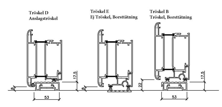 Som standard levereras dörren med tröskel D. Man kan som tillval få någon av modellerna B och E