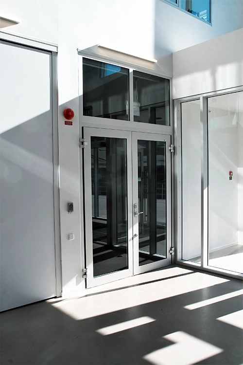 Frontshield™ 56 är ett oisolerat aluminiumprofilsystem som lämpar sig utmärkt för både utåt- och inåtgående dörrar. Systemet kan enkelt kombineras med sido- och överljus samt fasta fönsterpartier, vilket gör det till ett flexibelt val för moderna byggprojekt.