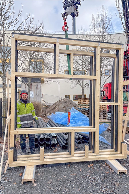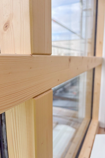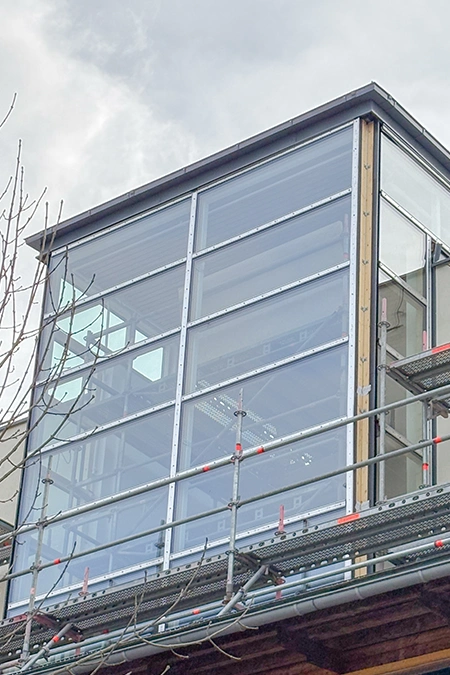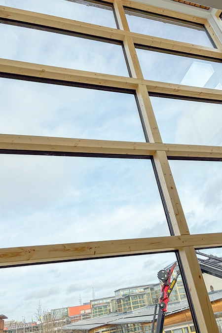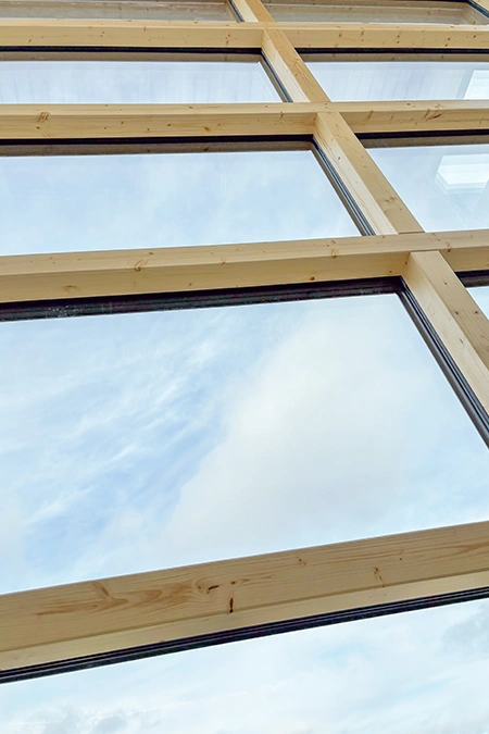 Våra träfasader för glas kombinerar estetik och funktionalitet på ett imponerande sätt. Dessutom skapar träets struktur en harmonisk kontrast mot glasets rena linjer, vilket förstärker helhetsintrycket. Samtidigt förenar vi trä och aluminium, två material som inte bara är enkla att återvinna utan också finns i stor mängd. Därför kan vi, i kombination med lågt CO₂-värde, erbjuda fasader som är extremt hållbara och som håller över tid. Utöver detta bidrar lösningen till minskad klimatpåverkan, vilket gör den bättre för miljön. Helt enkelt: framtidens fasad, redan idag!