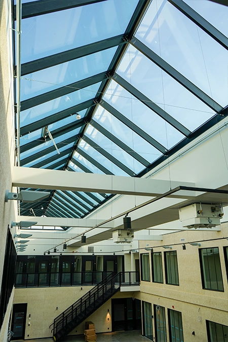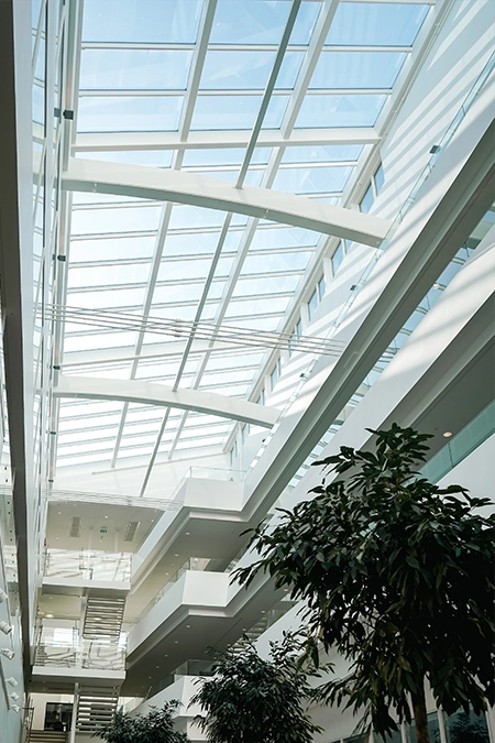 Vi har flera glastakssystem med stor frihet i gestaltning. Glastak för de riktigt stora projekten och skärmtak för de mindre. Vi har olika lösningar på glastak som ökar ljusinsläppet och förbättrar trivseln i er byggnad.