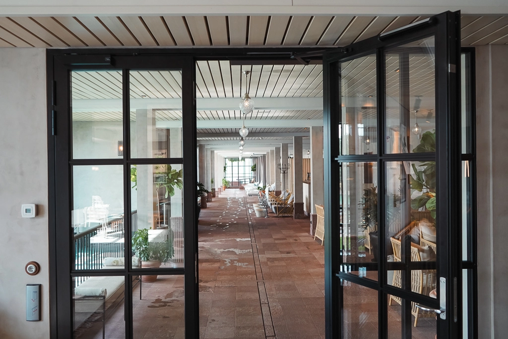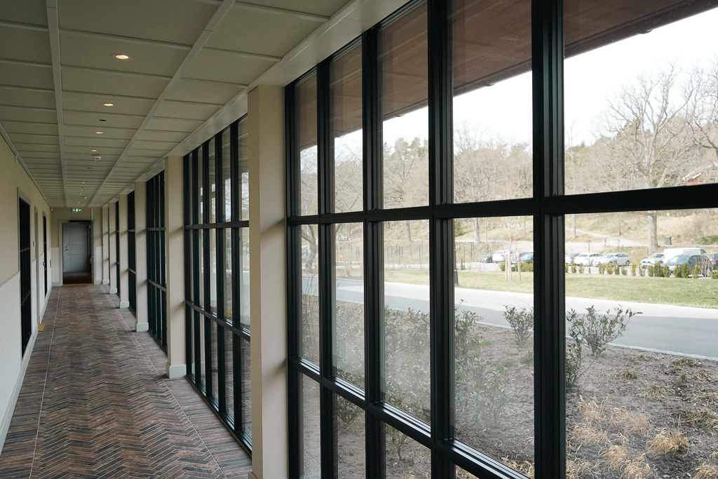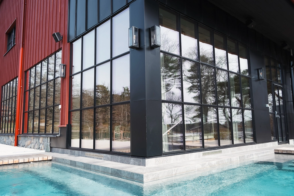 Glaspartierna är utformade med flera spröjs för att harmonisera med de jordnära kulörerna. Partiernas utformning ger en lugn och varm känsla som hela Smådalarö Gård återspeglar. Tillbyggnaden är väl genomtänkt från topp till tå, där glaset och partierna har en avgörande roll för att skapa en exklusiv samt lyxig men ändå närvarande känsla. Slutresultatet är en ultimat oas där man vill spendera många dagar.